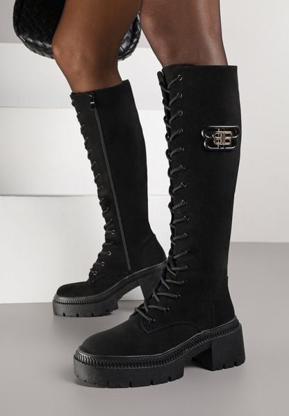 Czarne Kozaki Vices z Imitacji Zamszu w Stylu Grunge ze Sznurowaną Cholewką i Platformą Laurotte