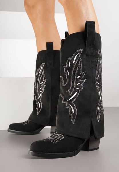 Czarne Kozaki w Stylu Kowbojek na Słupku z Haftem i Wywiniętą Cholewką Emmiste