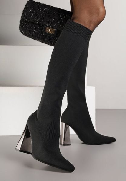 Czarne Skarpetkowe Kozaki Vices na Słupku z Metalicznym Połyskiem Tuvitte