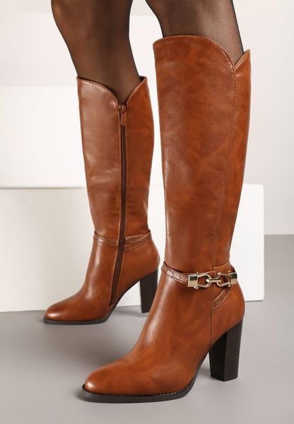 Brązowe Wysokie Kozaki na Słupku z Wywiniętą Cholewką i Paskiem z Klamerką Zaffela