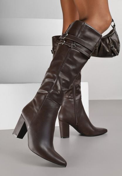 Brązowe Kozaki do Kolan na Słupkowym Obcasie ze Sprzączkami na Paskach Miobela