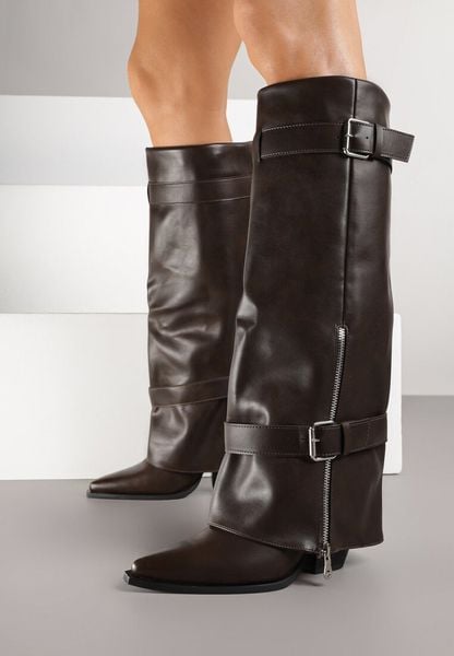 Brązowe Kozaki na Stożku z Cholewką Imitującą Nogawkę z Klamrami i Suwakiem Erseria