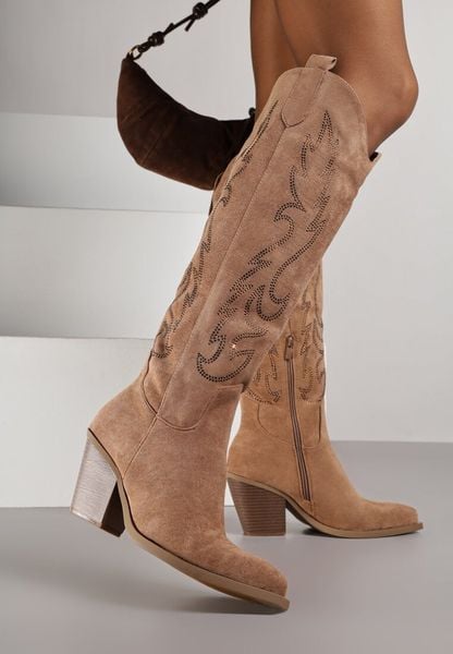 Jasnobrązowe Kozaki Kowbojki na Stożku z Cholewką w Cyrkoniowy Wzór Nalimia