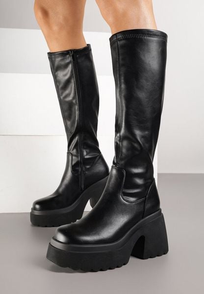 Czarne Kozaki na Grubej Podeszwie i Obcasie z Dopasowaną Cholewką Astigalla