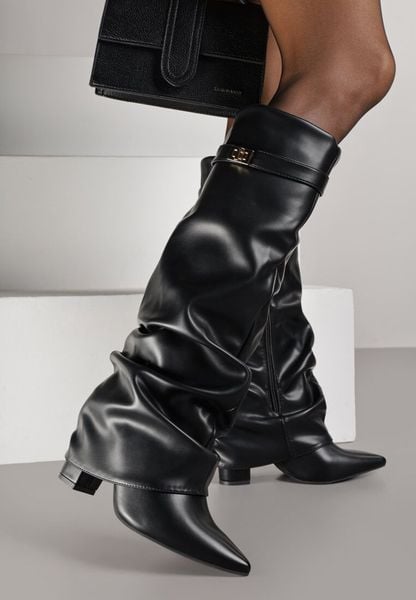 Czarne Marszczone Kozaki na Słupku z Wywiniętą Cholewką z Klamerką Cavea