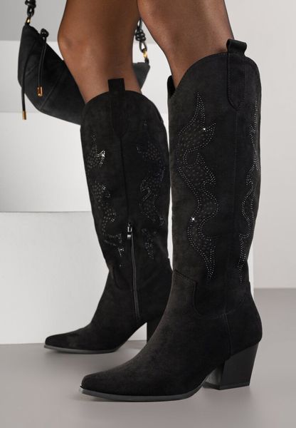 Czarne Kozaki Kowbojki na Stożkowym Obcasie Zdobione Cyrkoniami Nalasania