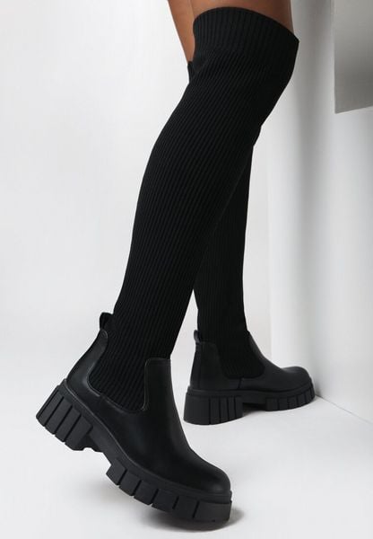 Kozaki Idandrou z wysoką, skarpetkową cholewką za kolano. Dół cholewki wykonany z ekoskóry, reszta z prążkowanej dzianiny. Osadzone na masywnej podeszwie z wypustkami. Okrągły nosek. Lekko ocieplone za pomocą koca obuwniczego. Długie kozaki z prążkowaną, skarpetkową cholewką to hit sezonu! Noś je w duecie z dzianinowymi sukienkami i skórzanym płaszczem.