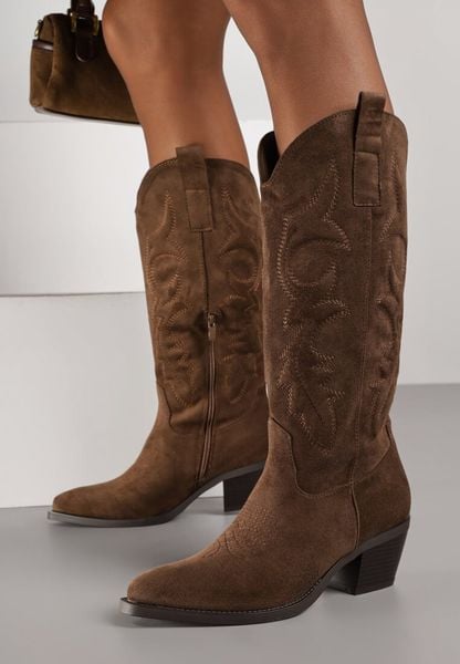 Ciemnobeżowe Kozaki Typu Kowbojki w Klasycznym Stylu z Imitacji Zamszu Rilamira