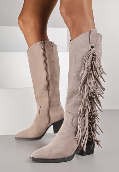 Beżowe Kozaki Kowbojki na Obcasie z Cholewką Zdobioną Frędzlami Novera