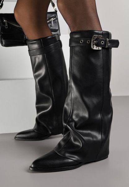 Czarne Kozaki z Noskiem w Szpic i Cholewką Imitującą Nogawkę z Klamrą Tusemira