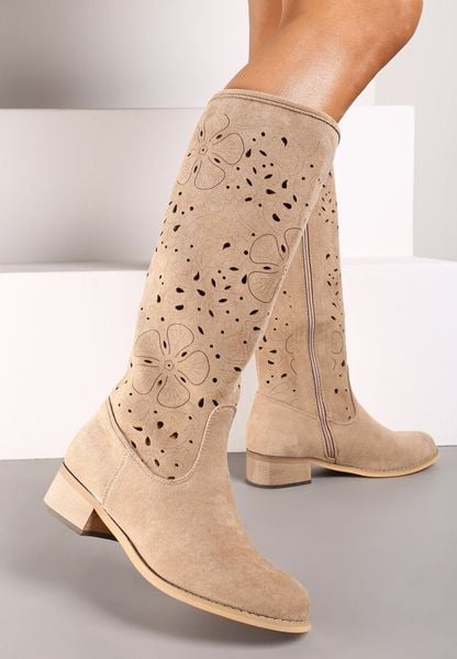 Ciemnobeżowe Kozaki na Płaskiej Podeszwie z Ażurowym Zdobieniem na Suwak Bralinda