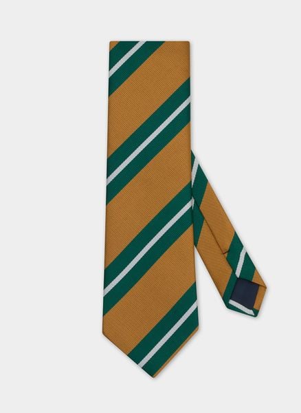 Krawat męski w kolorze piaskowym w zielone i białe pasy – Pako Lorente. Idealny dodatek do garnituru. Do stylizacji formalnych. Skład 100% poliester.
