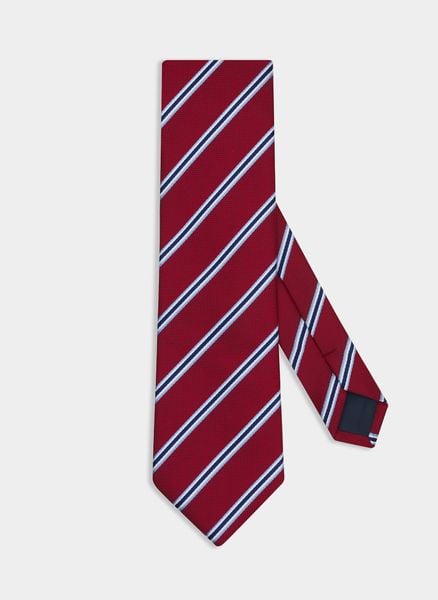 Krawat w kolorze bordowym w błękitno, białe i granatowe pasy – Pako Lorente. Idealny dodatek do garnituru. Do stylizacji formalnych. Skład 100% poliester.