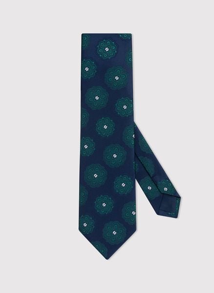 Granatowy krawat męski – Pako Lorente. Krawat w zielone rozetki. Skład: 100% poliester.