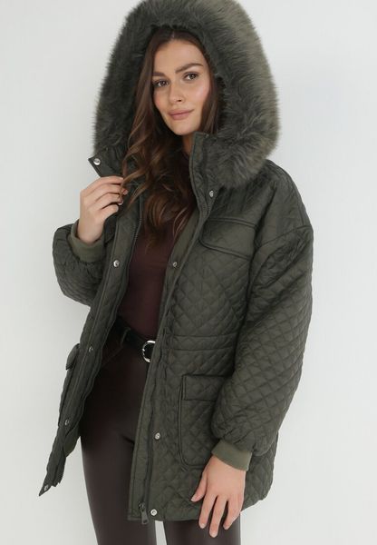 Ciemnozielona Kurtka z Futrzanym Kapturem i Drobnym Pikowaniem Esdrage