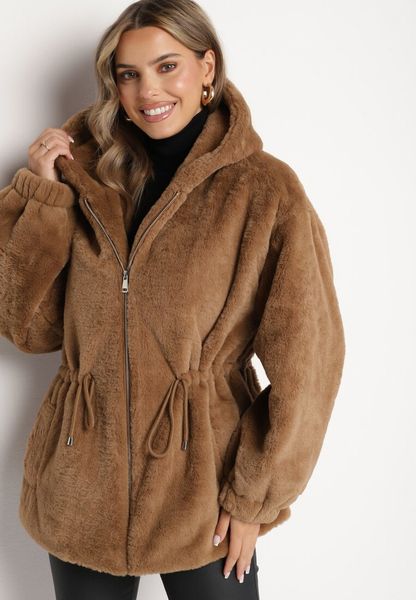 Brązowa Futrzana Kurtka z Kapturem i Ściągaczem w Talii Werirani