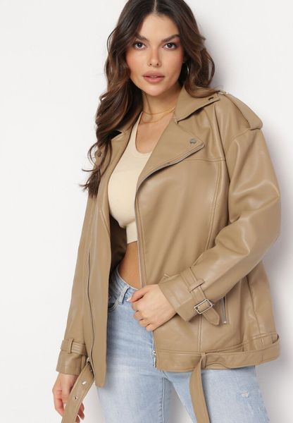Beżowa Kurtka Ramoneska z Ozdobnym Paskiem z Ekoskóry Kotiara