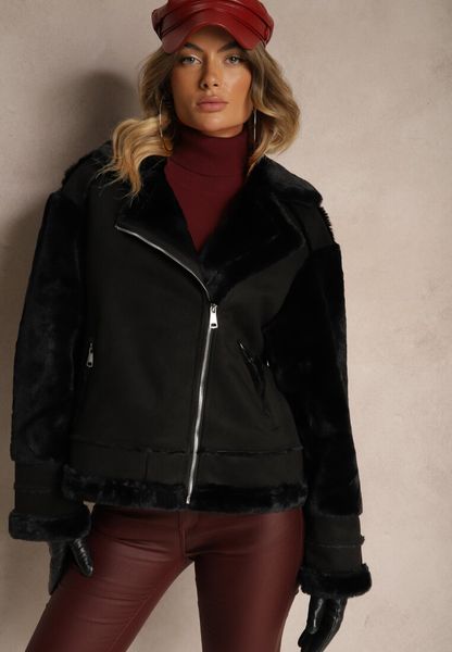 Czarna Ocieplona Kurtka Biker z Futerkiem i Asymetrycznym Zapięciem Lioyana