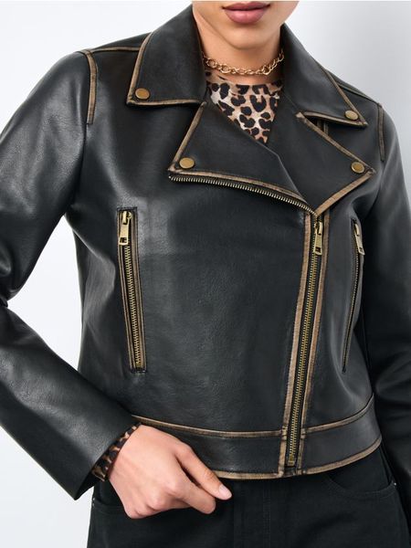 Sinsay – Kurtka biker z imitacji skóry – brązowy – zapięcie na suwak,2 kieszenie na suwak,ozdobne napy,imitacja skóry,długie rękawy