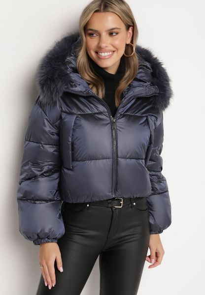 Granatowa Krótka Kurtka z Pikowaniem Kapturem i Odpinanym Futerkiem Vamizelle