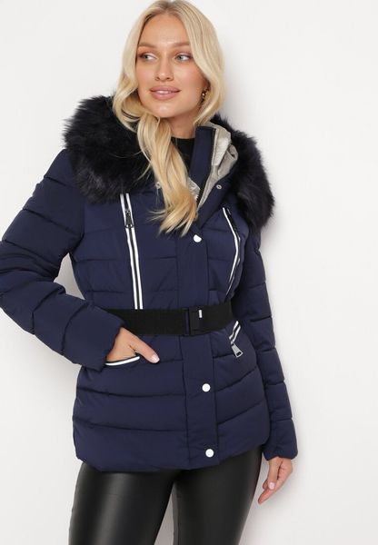 Granatowa Pikowana Kurtka z Paskiem w Talii i Odpinanym Futrzanym Kołnierzem Edalithia