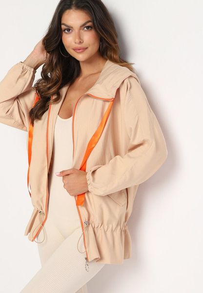 Ciemnobeżowa Kurtka Jednorzędowa z Bawełną Kapturem i Wstążką Zakończona Ściągaczem Martinis