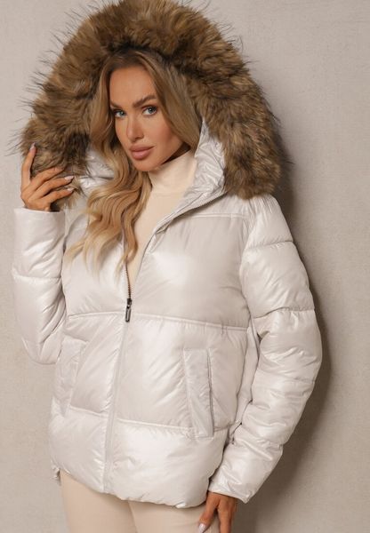 Biała Kurtka z Pikowanymi Przeszyciami i Kapturem z Futrem z Możliwością Odpięcia Innaia
