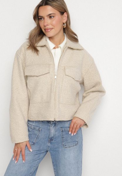 Beżowa Pudełkowa Kurtka z Kołnierzykiem i Kieszeniami o Krótkim Fasonie Neliella