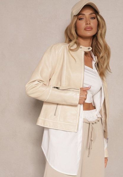 Beżowa Kurtka w Stylu Ramoneski z Ozdobnymi Paskiem i Suwakami Idivane