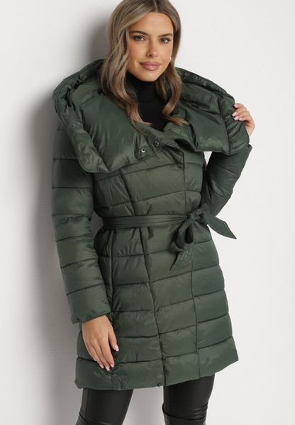 Zielona Pikowana Kurtka o Długim Kroju z Kapturem i Dodatkowym Paskiem Hanlin