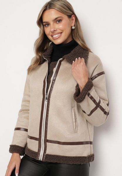 Beżowa Kurtka z Imitacji Zamszu z Kołnierzykiem i Futerkiem Belninnia