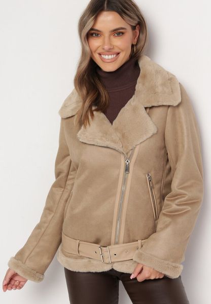 Beżowa Kurtka Pilotka z Asymetrycznym Zapięciem i Futerkiem Simuna