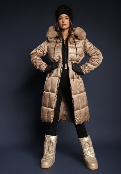 Ciemnobeżowa Kurtka z Pikowanymi Przeszyciami Paskiem i Kapturem z Futrem Lidanessa
