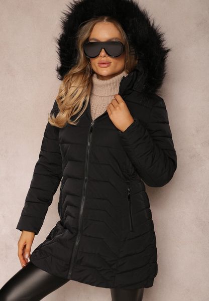 Czarna Kurtka Pikowana z Kapturem z Odpinanym Futerkiem i Dłuższym Tyłem Clorina