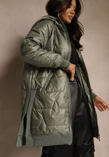 Zielona Pudełkowa Kurtka z Pikowanymi Przeszyciami i Kapturem Zdobiona Ściągaczami Hedilea