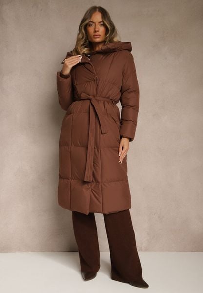 Brązowa Długa Kurtka z Pikowanymi Przeszyciami Kapturem i Wiązanym Paskiem Zalirra