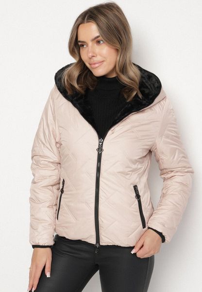 Różowa Dwustronna Kurtka o Kroju Parki z Kapturem i Futrzaną Podszewką z Pikowaniem Hetinia