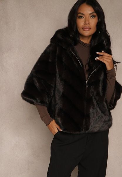 Czarna Kurtka Futrzana o Kroju Oversize z Kapturem i Rękawami 3/4 Titene