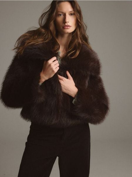 Kurtka o skróconym kroju, wykonana ze sztucznego futerka.