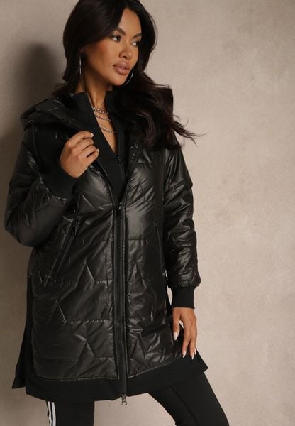 Czarna Przejściowa Kurtka z Kapturem Zdobiona Pikowaniem Fesulia