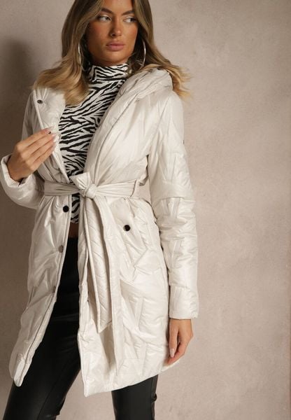 Jasnoszara Kurtka z Pikowanymi Przeszyciami Kapturem i Wiązanym Paskiem Erlexie