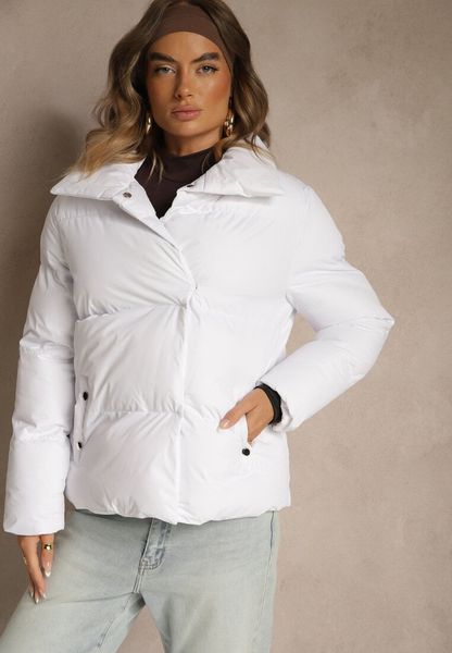 Biała Kurtka Zapinana na Napy z Odpinanym Kołnierzem i Materiałowymi Wstawkami Liolie