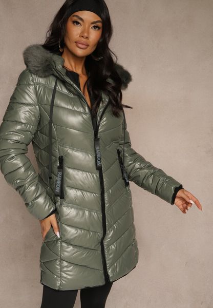 Zielona Taliowana Kurtka z Pikowanymi Przeszyciami i Kapturem z Futrem Nalidea