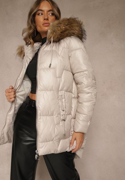 Beżowa Długa Kurtka Puchowa z Pikowanymi Przeszyciami i Kapturem z Futrem Zevea