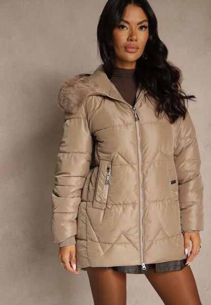 Beżowa Pudełkowa Kurtka z Pikowanymi Przeszyciami i Kapturem z Futerkiem Vebina