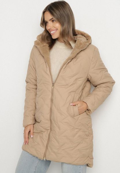 Ciemnobeżowa Długa Kurtka Dwustronna z Pikowanymi Przeszyciami i Kapturem Olidia