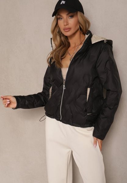 Czarna Kurtka z Pikowanymi Przeszyciami i Odpinanym Kapturem Ocieplana Futrem Reanara