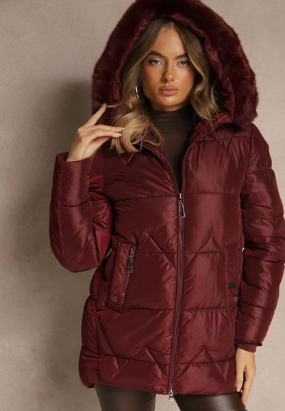 Bordowa Pudełkowa Kurtka z Pikowanymi Przeszyciami i Kapturem z Futerkiem Vebina