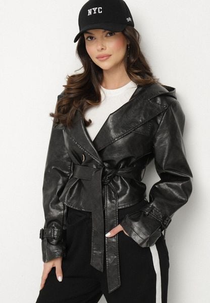 Czarna Krótka Kurtka Typu Trencz z Imitacji Skóry z Kapturem i Wiązanym Paskiem Nilianiela