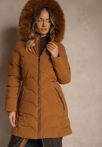 Brązowa Taliowana Kurtka z Pikowanymi Przeszyciami i Kapturem z Futerkiem Olennea